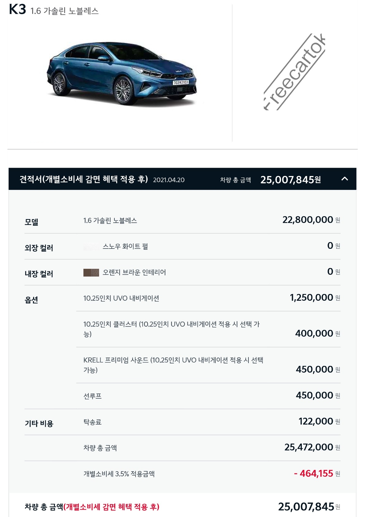 운전자에게 상황을 알려주는 운전자 주의 경고, 안전 하차 경고 등 일상생활에 필요한 모든 기술을 만나보실 수 있습니다. K3 모의 견적을 보면 1.6 휘발유 가격은 1,752만원~2,449만원으로 현재 시중에 나와 있는 그 어떤 차량보다 합리적인 가격대라고 볼 수 있다. 스노우 화이트 펄, 스틸 그레이, 플래티넘 그래파이트, 그래비티 블루, 미네랄 블루, 오로라 블랙 펄 등 다양한 색상으로 출시되어 선택의 폭이 넓습니다. 선루프, 프리미엄 사운드, 10.25 클러스터, 블랙핏 패키지 등 K3 풀옵션을 갖췄음에도 가격대는 2,629만원으로 요즘 시대에는 결코 찾아볼 수 없는 가격대라 생각된다.