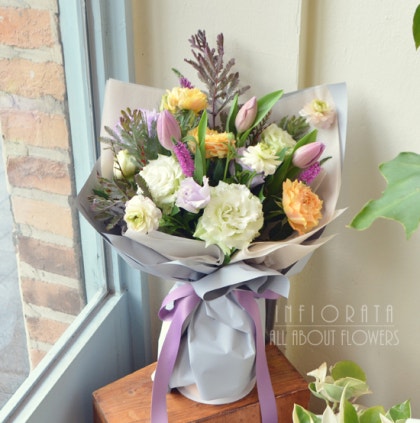 주물리에 장미, 수입 카네이션, 거베라, 리시안셔스, 옥시계란 수수, 바다 백합, 알스트로에메리아 보리 사초, 유칼립투스.