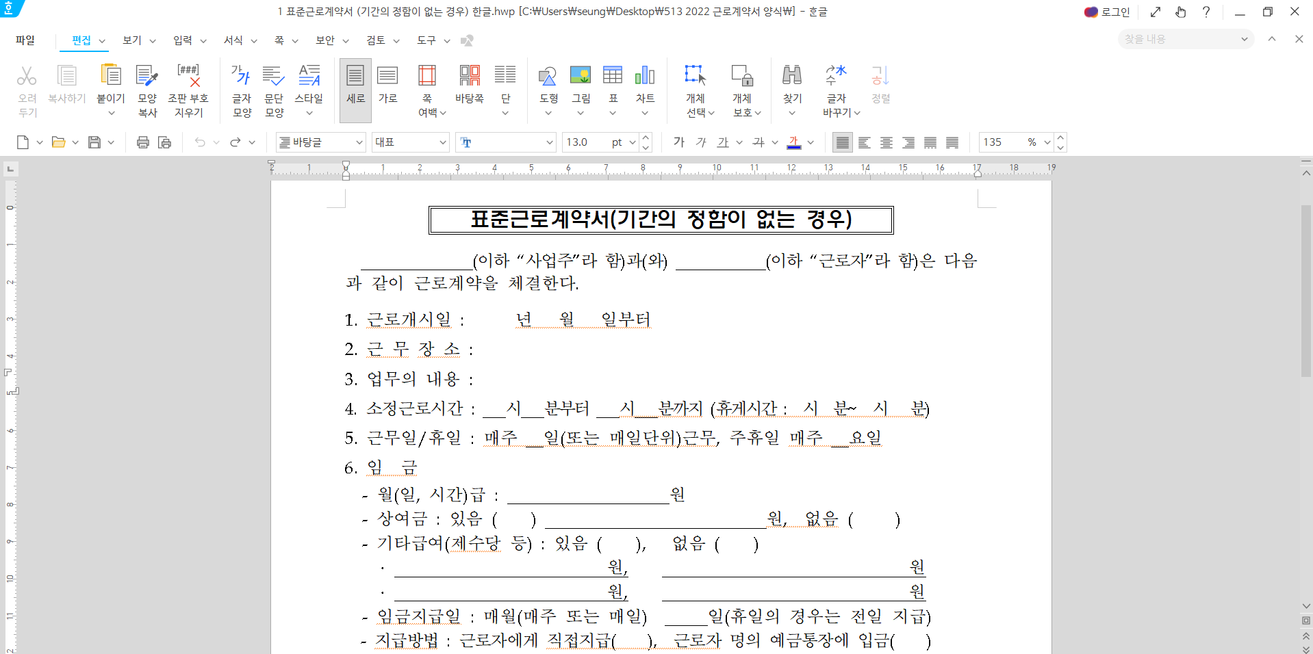 첨부파일표준근로계약서(서식).hwp다운로드 내 컴퓨터에 저장